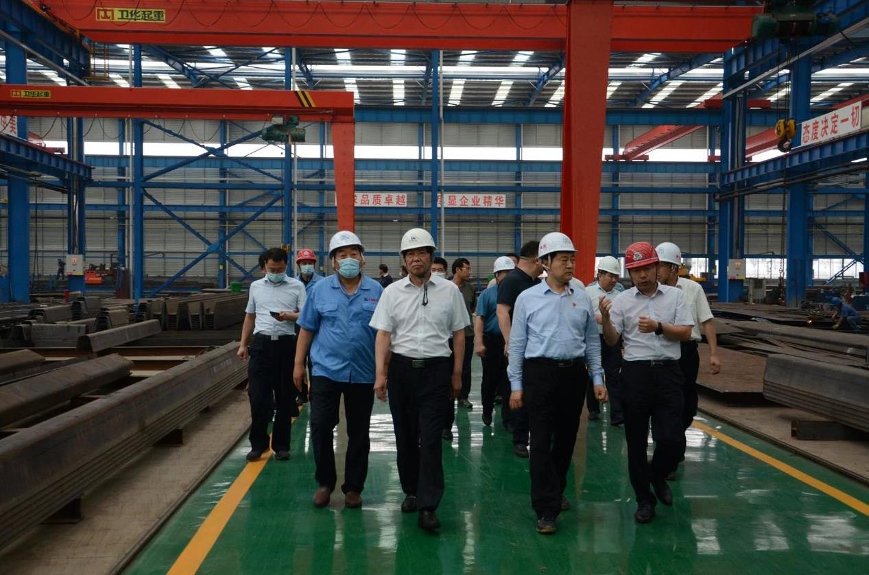 總經(jīng)理金躍山向劉宛康市長介紹了河南六建鋼結(jié)構(gòu)裝配式產(chǎn)業(yè)園區(qū)的建設(shè)生產(chǎn)情況。劉宛康市長一行先后參觀了鋼橋梁生產(chǎn)線預(yù)處理車間、單元件車間、總拼車間,并詳細(xì)了解了公司的產(chǎn)品優(yōu)勢、技術(shù)創(chuàng)新、市場發(fā)展前景等。